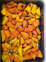 - Alles in Stücke schneiden und in jeweils eine Auflaufform füllen (also Kürbis und Süßkartoffel in die eine, Blumenkohl in die andere)
